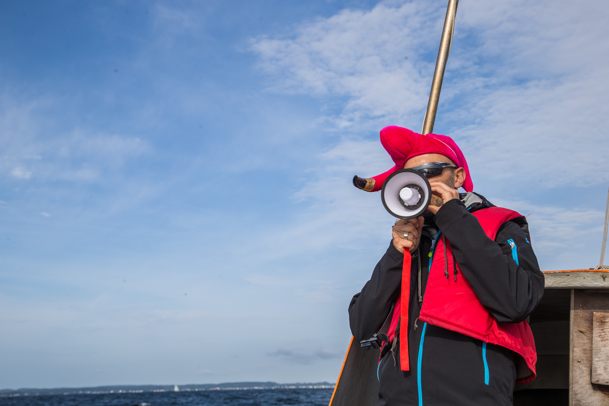 On the safety boat I was escorted by our pilot Thomas as well as Uffe, Martin and freelance photographer Stine. Dennis started the swim with me but chose to clamber back on the boat after some time as he couldn’t get rid of his frustrations due to the weather conditions. A most difficult but most noble decision! It takes guts to let yourself get pulled out of the water in the middle of a challenge. Respect!