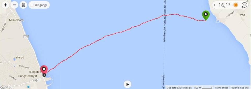 July 19 – I crossed the Sound between the Swedish Island of Ven and Rungsted harbour in Denmark. Surprisingly I made the 10 km crossing in a pretty straight line despite the rough water conditions during the first half of the swim. This shows how crucial a part your pilot plays in your swim!