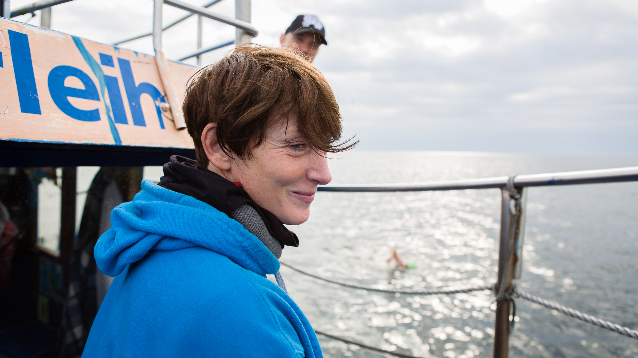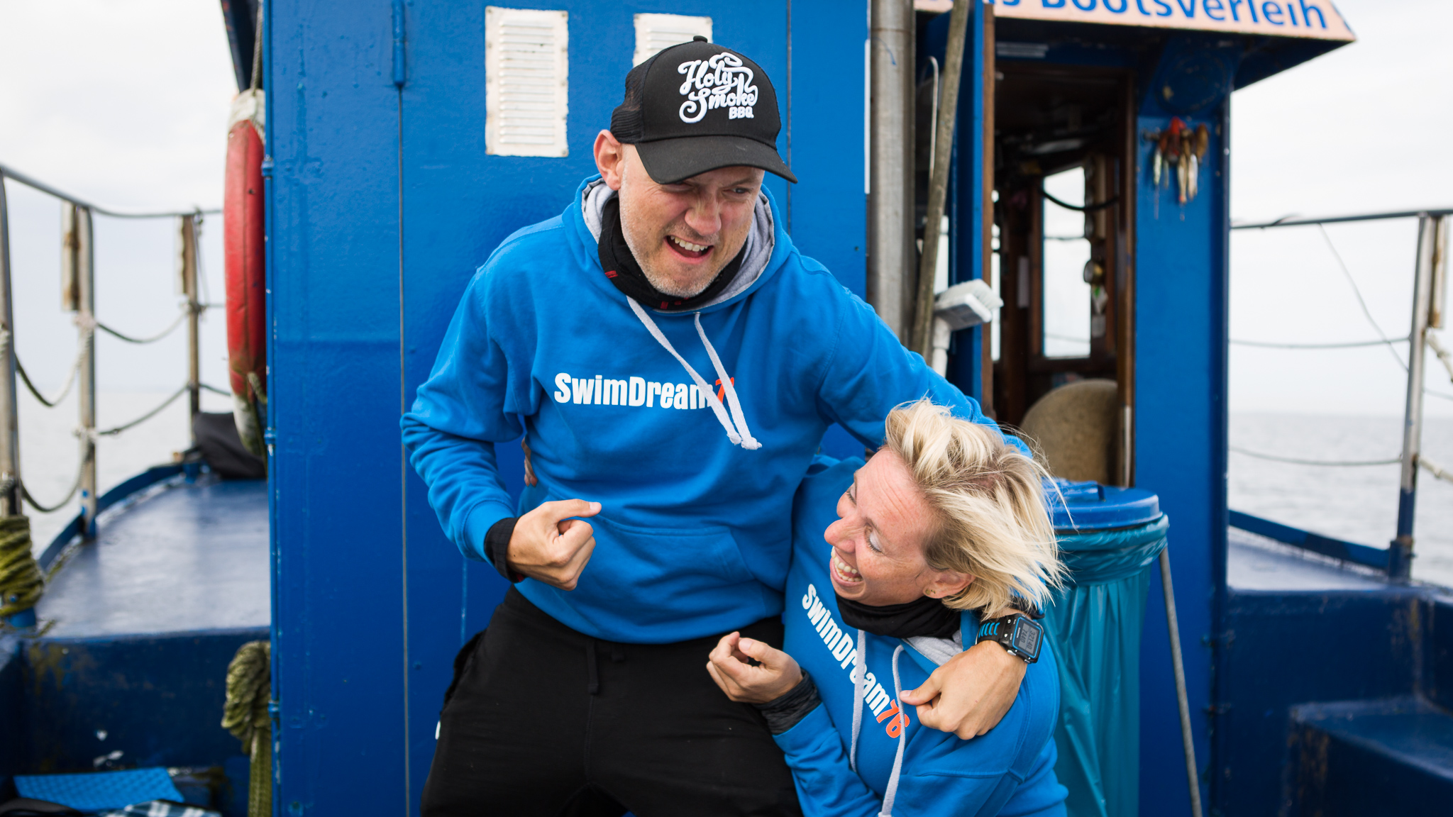 All in all, we had the smoothest crossing ever. Britta sat at the front, keeping an eye on my flow and technique while helping the pilot to keep pace with me. During my first feeding an hour into the swim, we realized how quickly I was drifting away, so we decided to keep my feeding breaks around 20-30 seconds. No time to pee or chat, but thanks to our whiteboard I received all kinds of encouraging comments from family, friends and my amazing Formel76 members. Besides, my team was extremely creative and found a thousand ways to support me along the way, including some pretty hot (and hairy) mooning! 🙈😂